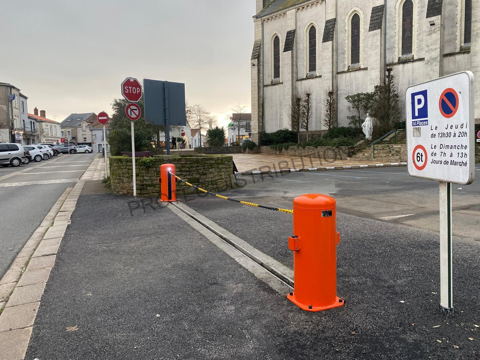 Barrière à chaîne motorisée automatique - Système hydraulique pour un usage intensif. Modèle sur-mesure, conçu pour le Salon des Maires 2021 à Paris, avec LED fixes et clignotantes intégrées. Potelet assorti comprenant des feux de trafic rouge/vert et une signalisation LED